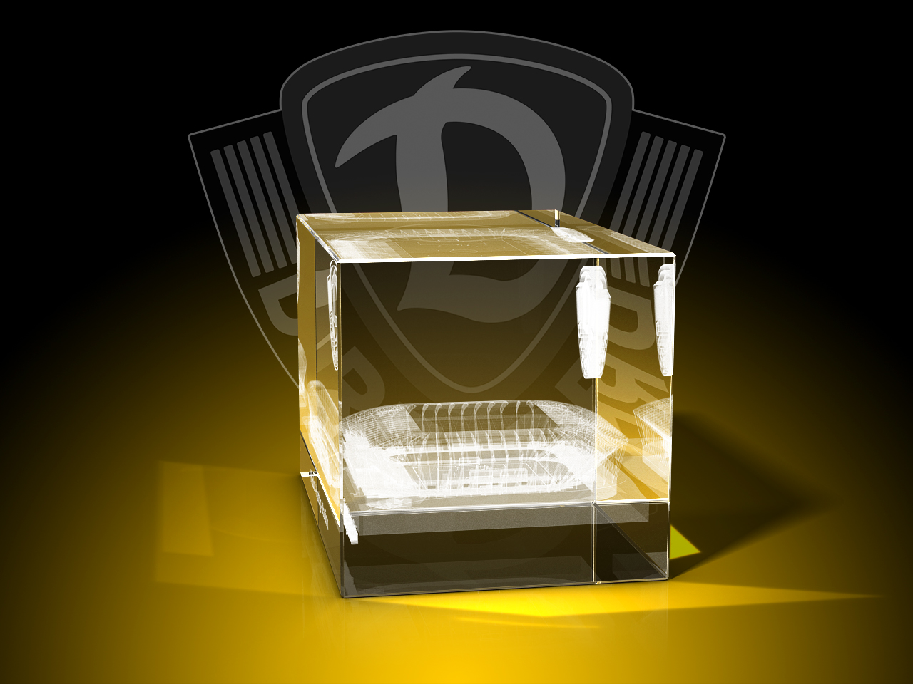 Das neue "Dynamo Stadion Dresden" inklusive Dynamo-Emblem wird in einem Glasquader dreidimensional mit einer Glasinnengravur auf ewig festgehalten und in einer edlen Geschenkverpackung geliefert.